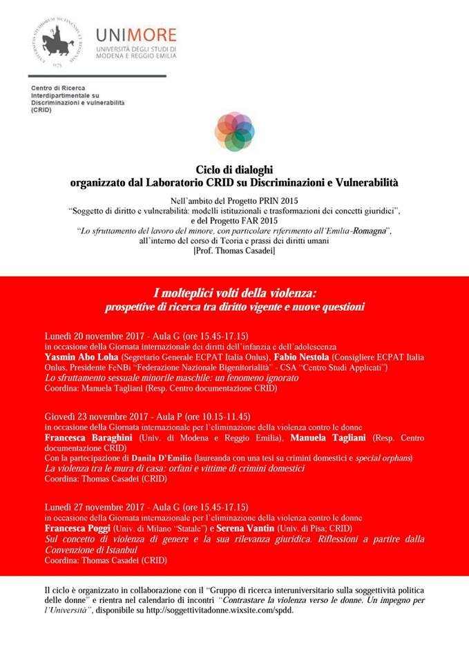 Tre dialoghi organizzati dal Laboratorio su Discriminazioni e Vulnerabilità del CRID, diretto presso Unimore dal Prof. Gianfrancesco Zanetti, affrontano col contributo di esperti ed esperte I molteplici volti della violenza: prospettive di ricerca tra diritto vigente e nuove questioni.