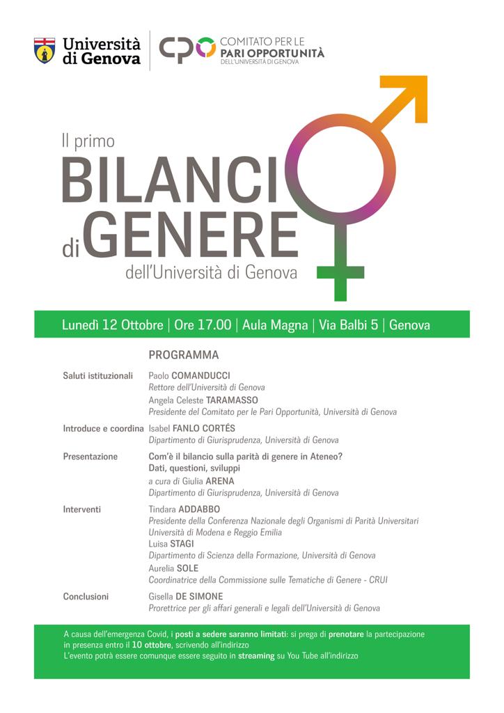 Lunedì 12 ottobre 2020, alle 17:00, presso l'aula Magna dell'Università di Genova in Via Balbi 5 a Genova, è organizzato il convegno "Il primo bilancio di genere dell'Università di Genova".