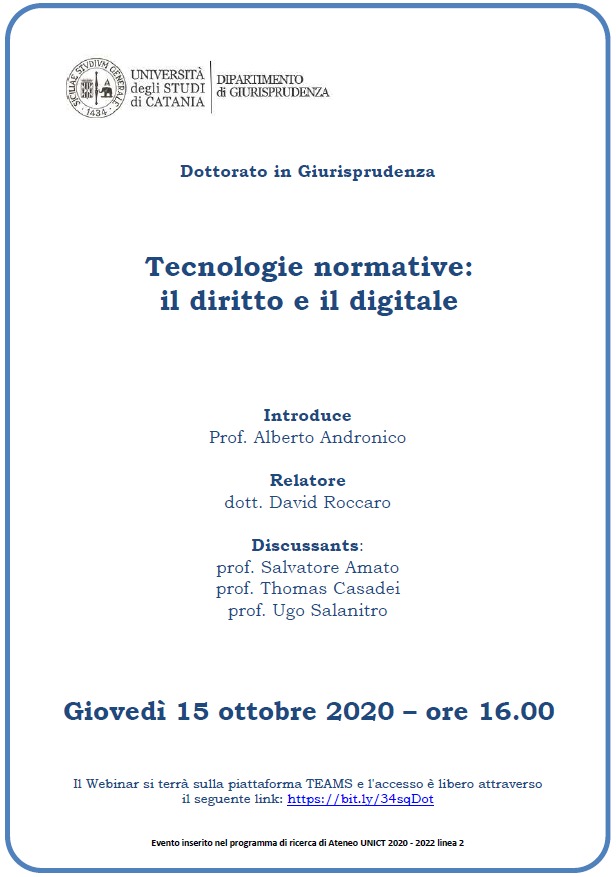 Giovedi 15 ottobre 2020, ore 16:00, la scuola di Dottorato in Giurisprudenza dell'Universitą di Catania organizza un evento dal titolo "Tecnologie normative: il diritto e il digitale".