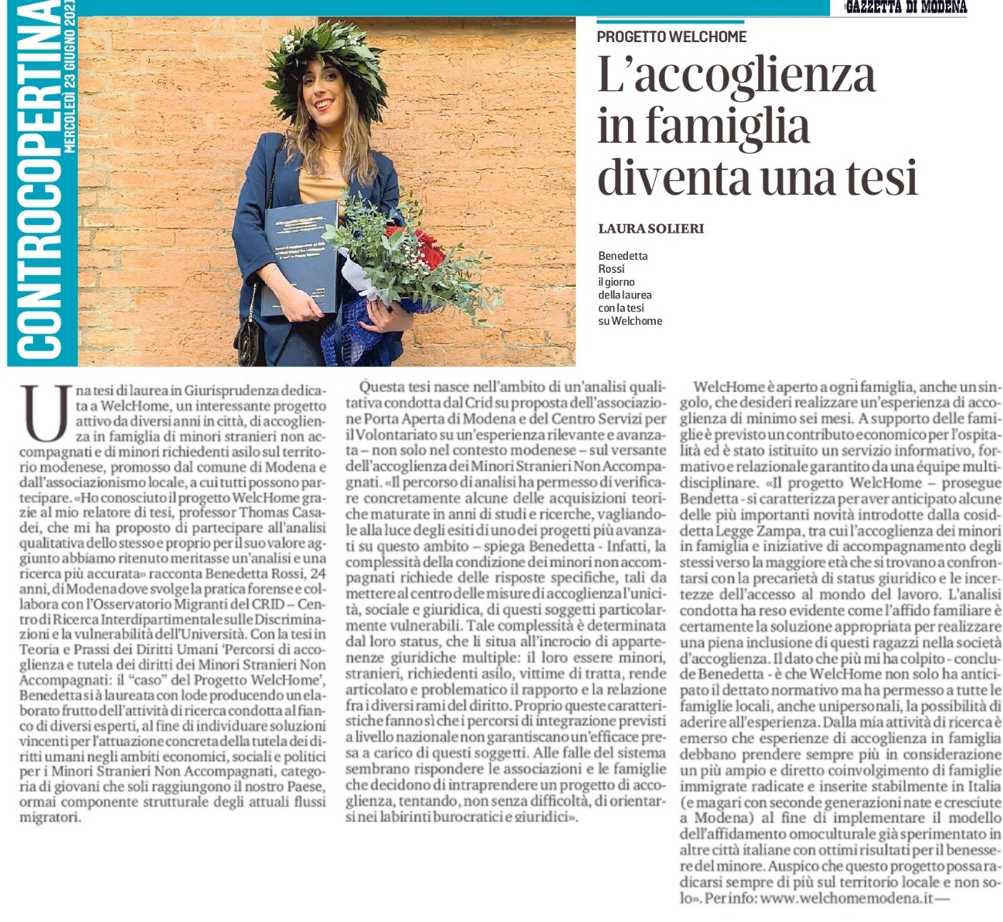 La Dott.ssa Benedetta Rossi si č laureata in Giurisprudenza presso il nostro Dipartimento con la tesi dal titolo "Percorsi di accoglienza e tutela dei diritti dei minori non accompagnati: il caso WelcHome", relatore il Prof. Thomas Casadei.