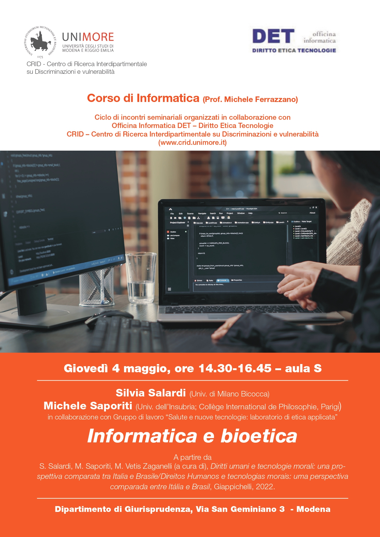 In particolare, si segnala l'incontro di giovedì 4 maggio 2023, ore 14:30, in aula S, tenuto dalla Prof.ssa Silvia Salardi (Università di Milano Bicocca) e Prof. Michele Saporiti (Università dell'Insubria) su Informatica e bioetica, a partire dal volume S. Salardi, M. Saporiti, M. Vetis Zaganelli (a cura di), Diritti umani e tecnologie morali; una prospettiva comparata tra Italia e Brasile, Giappichelli, 2022.